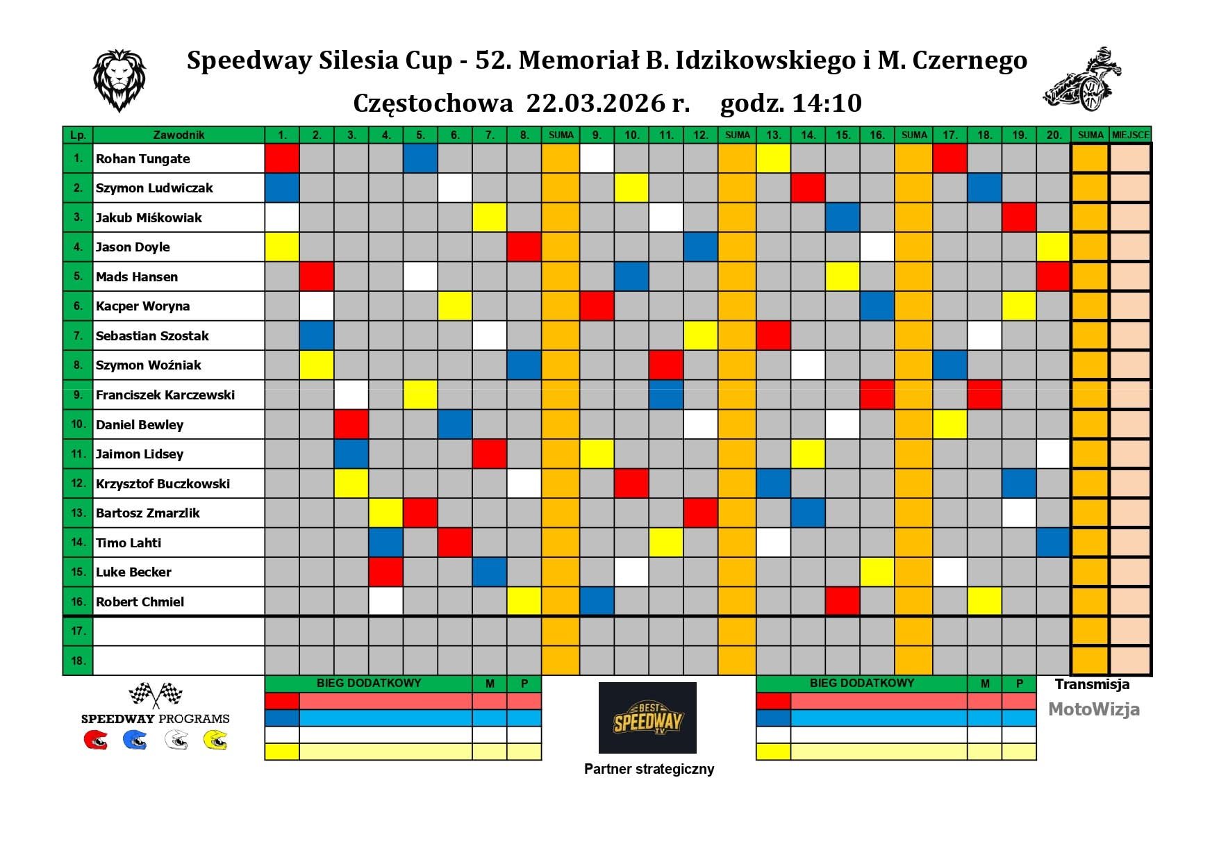 List of riders for the Zenon Plech International Film Festival IMME Meeting, Lodz, 28.03.2026: Bartosz Zmarzlik (ORLEN OIL MOTOR Lublin) – 2,643 Patryk Dudek (PRES GRUPA DEVELOPERSKA Toruń) – 2,363 Artem Laguta (BETARD SPARTA Wroclaw) – 2,236 Brady Kurtz (BETARD SPARTA Wroclaw) – 2,209 Michael Jepsen Jensen (BAYERSYSTEM GKM Grudziądz) – 2,204 Piotr Pawlicki (FOGO UNIA Leszno) – 2,177 Leon Madsen (STELMET FALUBAZ Zielona Góra) – 2,172 Mikkel Michelsen (PRES GRUPA DEVELOPERSKA Toruń) – 2,149 Jack Holder (GEZET STAL Gorzów) – 2,145 Maksym Drabik (BAYERSYSTEM GKM Grudziądz) – 2,136 Emil Sajfutdinow (PRES GRUPA DEVELOPERSKA Toruń) – 2,126 Przemysław Pawlicki (STELMET FALUBAZ Zielona Góra) – 2,074 Martin Vaculik (ORLEN OIL MOTOR Lublin) – 2,042 Wiktor Przyjemski (ABRAMCZYK POLONIA Bydgoszcz) – winner of Red Bull Junior Asy 2025 Damian Ratajczak (STELMET FALUBAZ Zielona Góra) – junior from heat no. 2 of the PGE Ekstraliga 2025 Wild Card – TBA Tickets for the Moto Arena event in Łódź are now on sale. Tickets are available at https://www.biletynazuzel.pl/ . Ticket prices: Regular ticket: PLN 50 Reduced ticket (up to 18 years): PLN 25