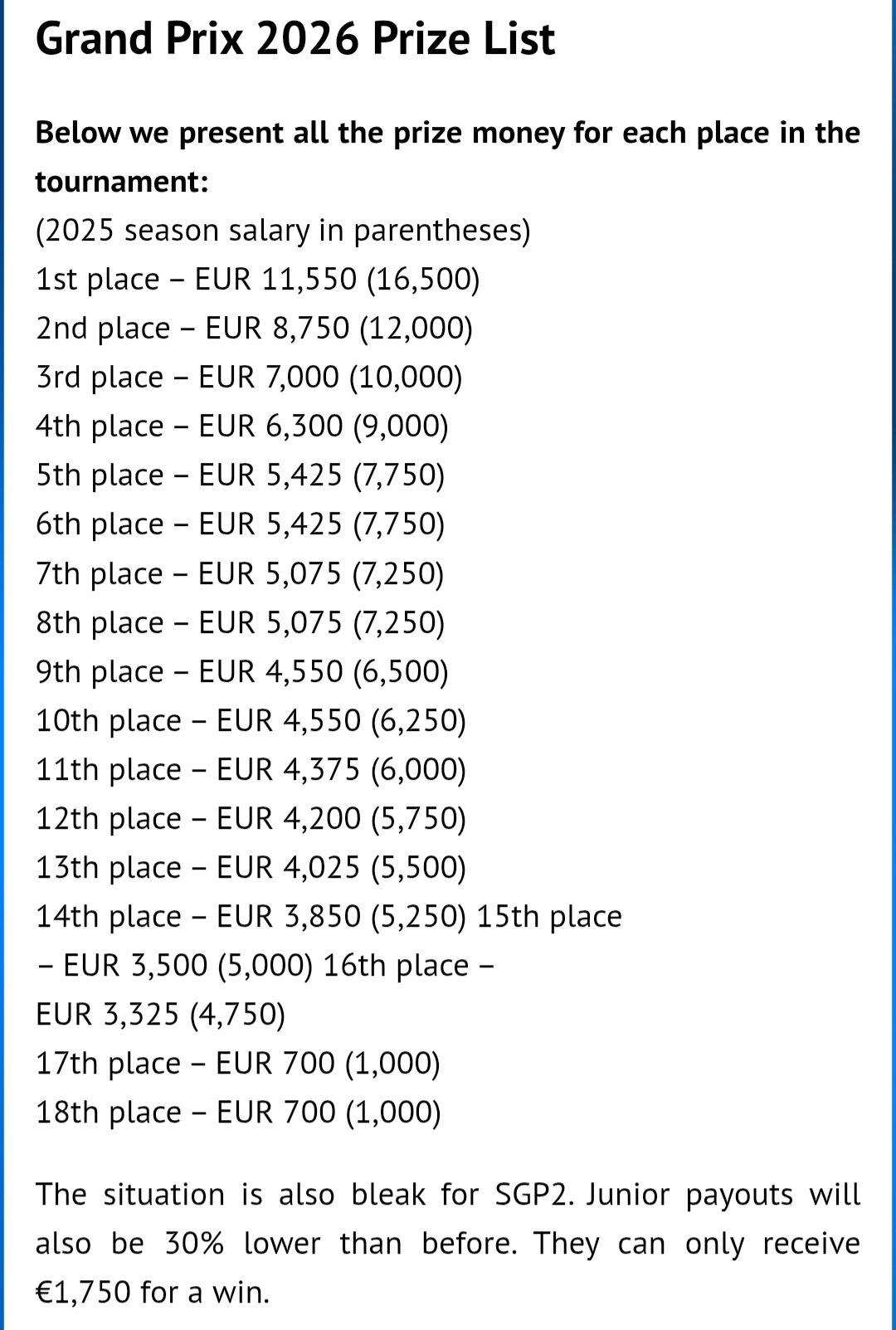 stewmac Posted 3 hours ago Report Share Posted 3 hours ago (edited) Prize money per round for 2026. Quite a reduction from 2025...: Edited 3 hours ago by stewmac 1 1 Quote Link to comment Share on other sites More sharing options...